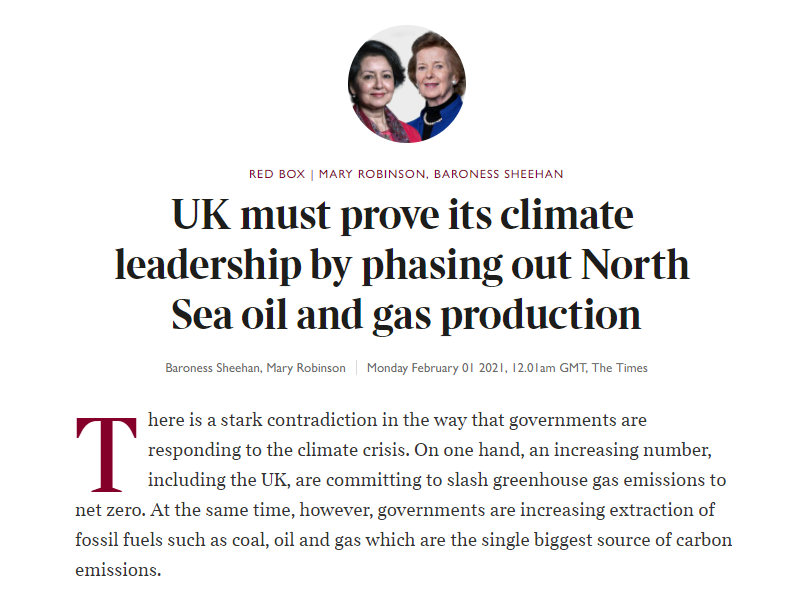 UK must prove its climate leadership by phasing out North Sea oil & gas production, say Mary Robinson & Baroness