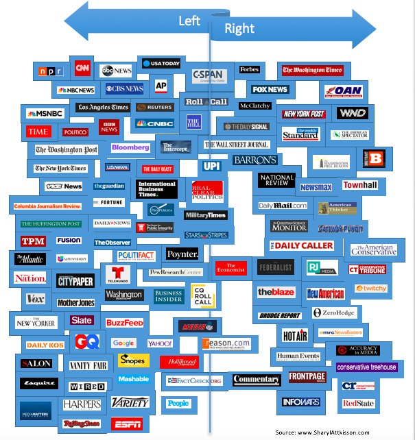 If you think BBC is left, you also probably think the DUP is a left leaning party. Half of thse are ridiculously incorrect, such as Infowars only a slight bit to the right, on top of having what are essentially duplicates. I need to find who made this and tell them they're wrong