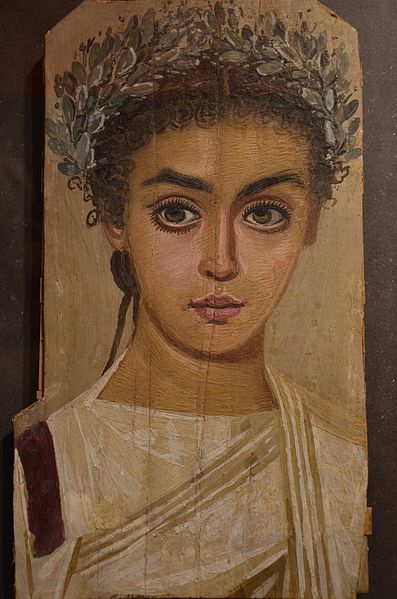 This lively portrait of a young Roman girl, whose hair is adorned with a wreath of leaves, is painted on a panel of sycamore wood. Areas of light and dark (chiaroscuro) lend depth and threedimensionality to the girl’s face. Roman Egypt, AD 120-150. http://www.liebieghaus.de/en/antike/mummy-portrait-girl … pic.twitter.com/O5BKOsHCry