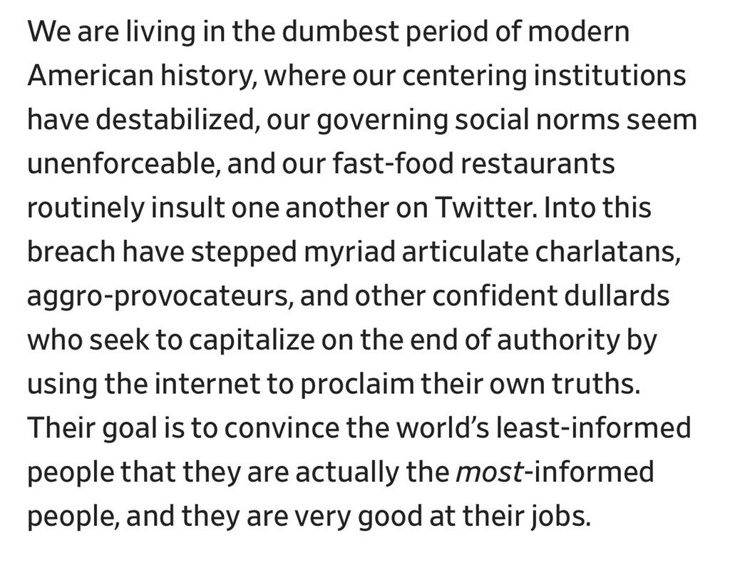 I had an animation professor (nothing wrong with that) who doesn't know a single thing about evolutionary biology (bad) confidently regurgitating what Buzzfeed told him about the matter (*in* the context of my claiming the media got it wrong). Almost no epistemological humility.