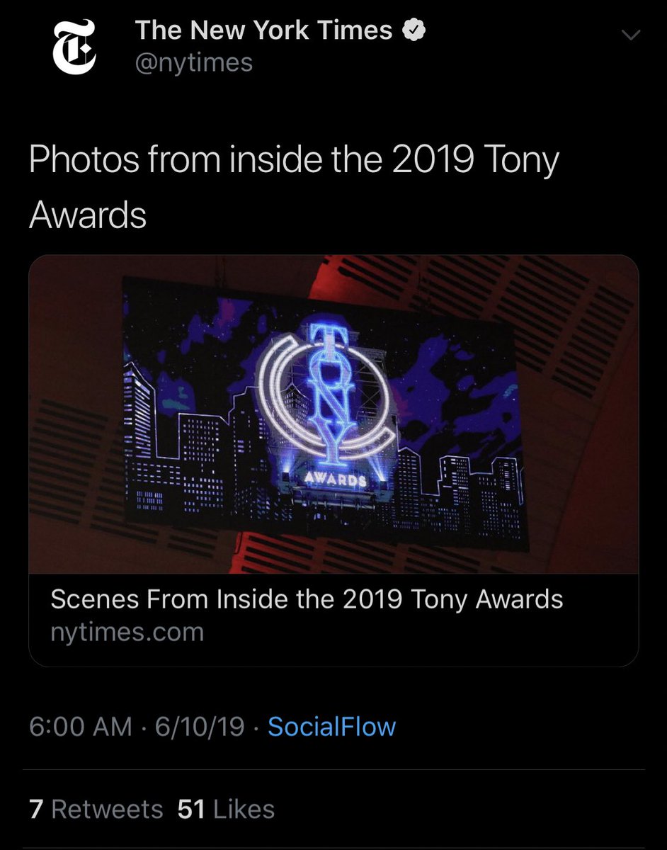 7 retweets out of 40 million followers? Either folks really _hate_ the Tony Awards, or the NY Times follower count is.... let's just call it 'gamed'