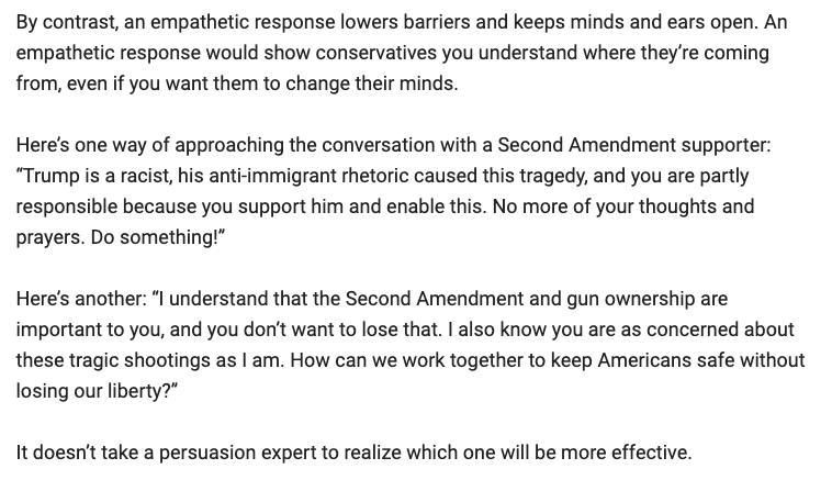 Great advice on how to persuade rather than polarize on gun control. Basic moral psych, Dale Carnegie: https://www.foxnews.com/opinion/lee-carter-gun-control-is-what-most-americans-want-heres-the-only-way-for-both-sides-to-get-there …pic.twitter.com/Wo8In8qD2T