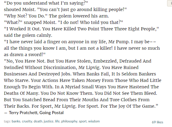 Reminded of this Terry Pratchett quote. @terryandrob "Your Actions Have Taken Money From Those Who Had Little Enough To Begin With. In A Myriad Small Ways You Have Hastened The Deaths Of Many. You Do Not Know Them. You Did Not See Them Bleed"pic.twitter.com/vS312NZJFZ