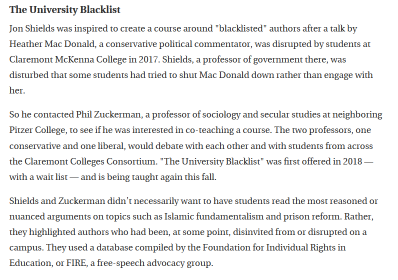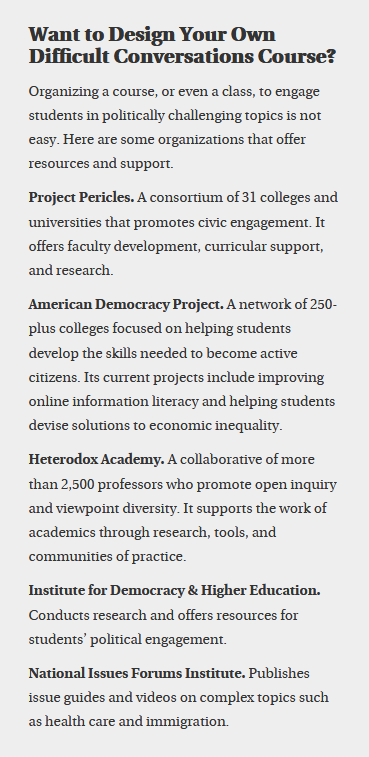 Professors are coming up with unique ways to encourage civil debate on hot topics. For example, a "university blacklist course" where students read books of dis-invited speakers and engage in healthy debate https://www.chronicle.com/article/These-Professors-Help-Students/247172/ …pic.twitter.com/JJImVfYSU7
