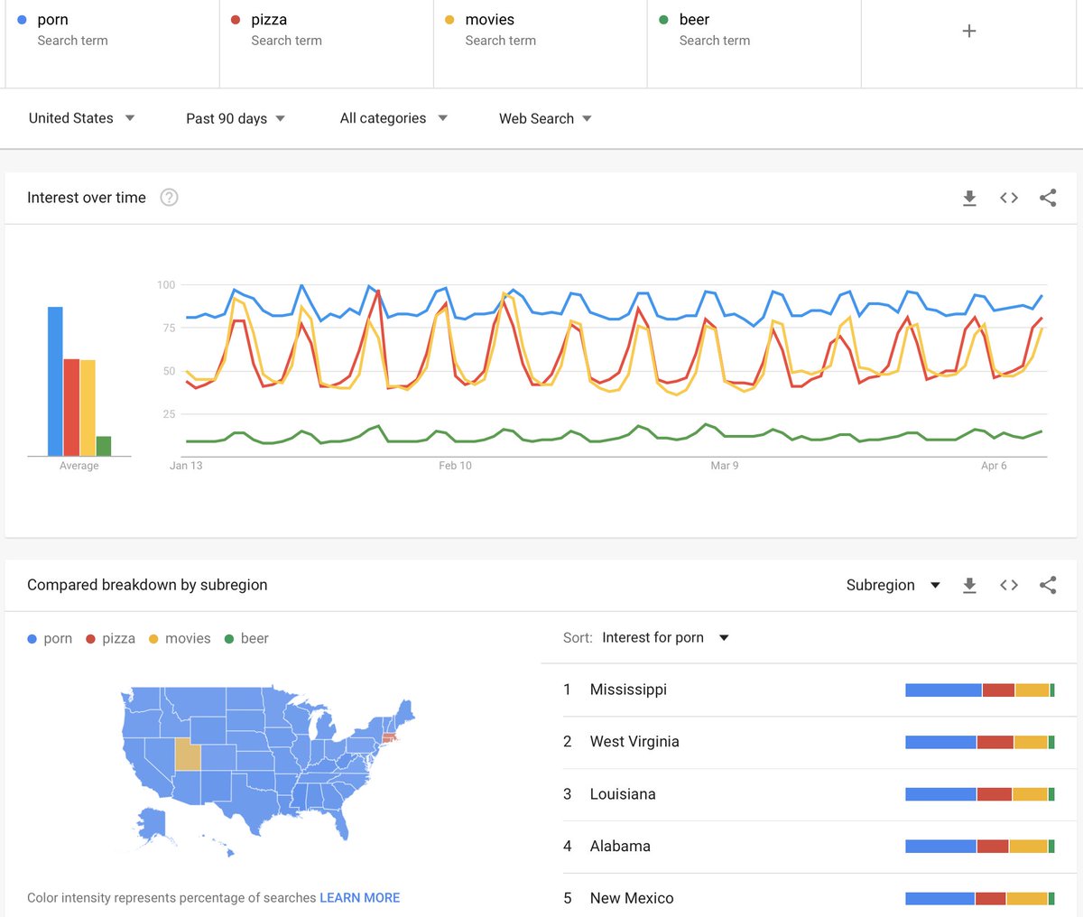 Google trends seems to indicate little general increase in interest in these things (porn, pizza, movies, beer), but weekdays and weekends are looking more similar now than they did a couple months ago.pic.twitter.com/a7aRVWmIVF
