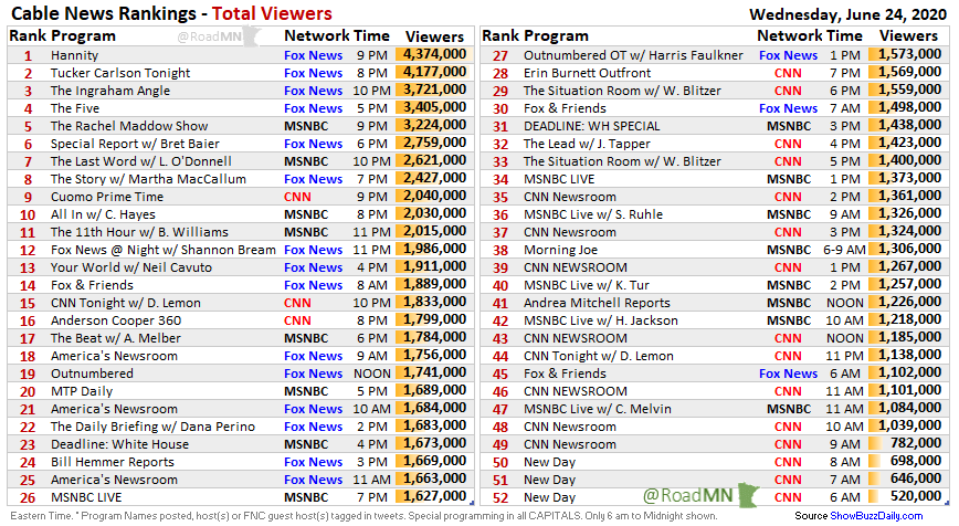 Cable News Rankings Wed Jun 24 1⃣@SeanHannity 2⃣@TuckerCarlson 3⃣@IngrahamAngle 4⃣@TheFive @DanaPerino @GregGutfeld @JesseBWatters @TheJuanWilliams @DagenMcDowell 5⃣@Maddow 6⃣@BretBaier 7⃣@Lawrence 8⃣@MarthaMacCallum 9⃣@ChrisCuomo 🔟@ChrisLHayes pic.twitter.com/zlnWlEw4uH
