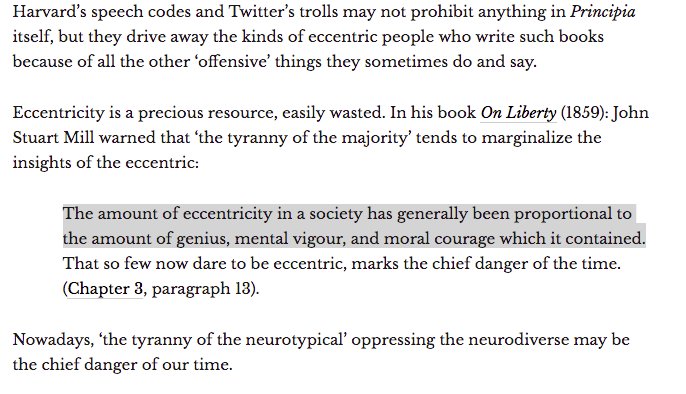 Great essay on free speech, reminding us how much we owe to really weird people and how much they need elbow room. http://quillette.com/2017/07/18/neurodiversity-case-free-speech/ …pic.twitter.com/Rurz47uWPF