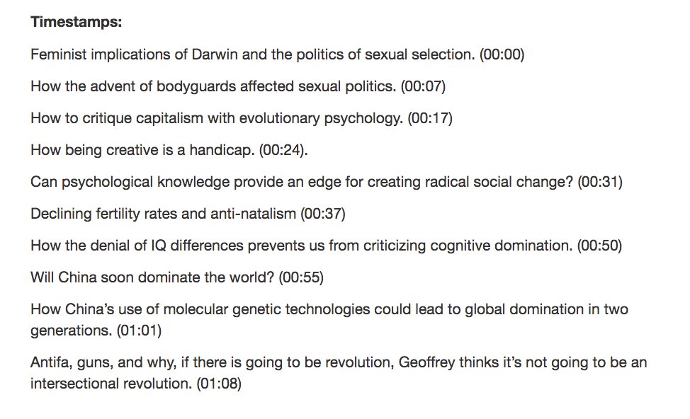 ICYMI, here are some timestamps from the first part of my conversation with Geoffrey Miller. http://j.mp/2yfId1C pic.twitter.com/Mh2PqTvX09