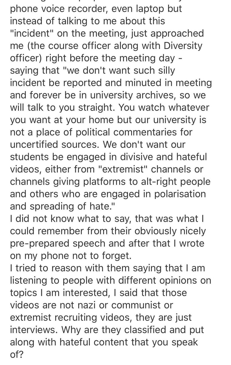 Excerpts of a message I got from a student who was reprimanded at a university library for watching a video of @benshapiro and me. He was issued “a warning.”pic.twitter.com/BPBFVBONrO