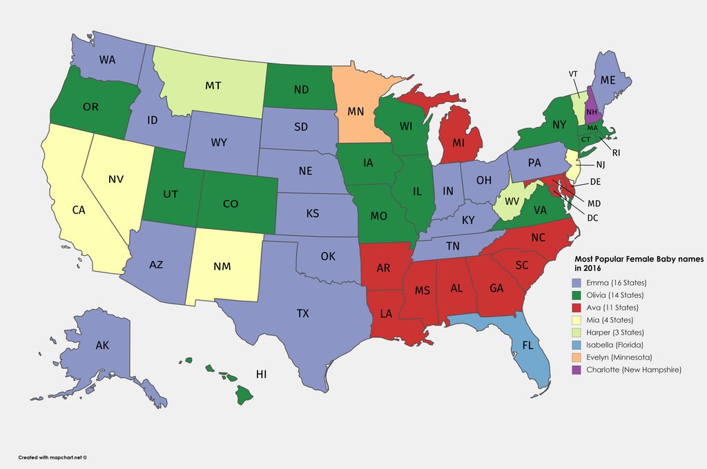 #Map shows most popular female baby names in the #USA in 2016 by state. Emma super popular but Ava is hip too! Source: https://buff.ly/2pHFneZ pic.twitter.com/1rvKRfgiWr