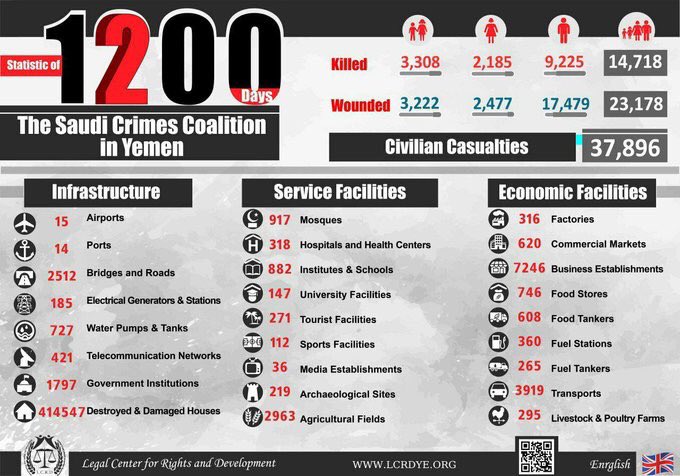 #1200DaysOfWarOnYemen by the#US#UK backed#Saudi#UAE Coalition: - 14,718 dead (including +3,000 children) -23,178 wounded (including 3,222 children) Making a total of 37,896 innocent civilian casualties while the global community silence continues#Yemen#اليمنpic.twitter.com/4ImPj0ZCqAএই মিডিয়াতে সংবেদনশীল উপাদান থাকতে পারে। আরও জানুন