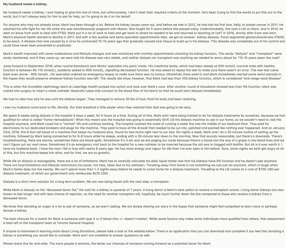 My best chance for survival and living a normal life is a transplant. Please read the wonderful message that my wife Megan has sent out to to friends and family. It sums up my story and why a living donor is my best option. 2/npic.twitter.com/2lVbyTWHRq