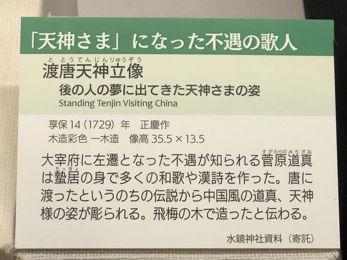 #菅原道真 は蟄居の身で多くの和歌や漢詩を作った。唐に渡ったというのちの伝説から中国風の道真。天神様の姿が彫られる。」#福岡市博物館 企画展示室『筑紫のうたを詠んだ人』にて展示中。 (令和2年3月15日まで)pic.twitter.com/SFLvg1sAVR