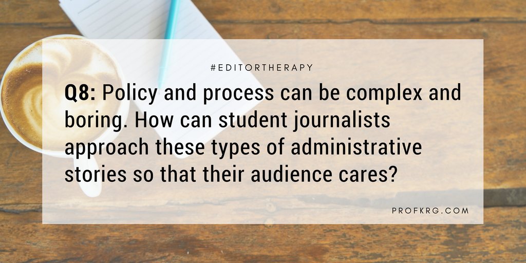 A8) Finding a central character is huge, like talking to a student who can no longer afford school after a tuition increase. Having someone who has been impacted by the process or policy tells the story in a unique way.