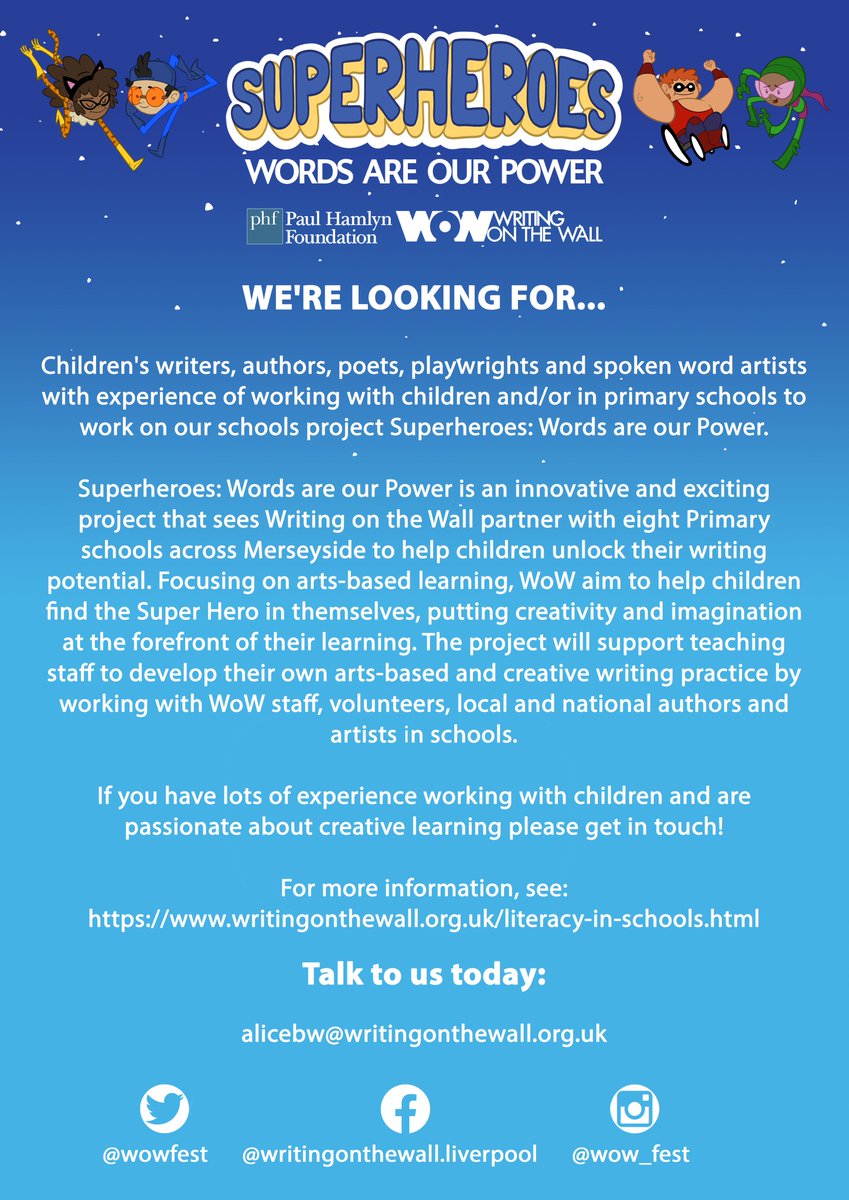 With experience of working with children and/or in primary schools as part of our schools project, Super Heroes: Words are our Power! Email alicebw@writingonthewall.org.ukpic.twitter.com/5pYtTACwmt