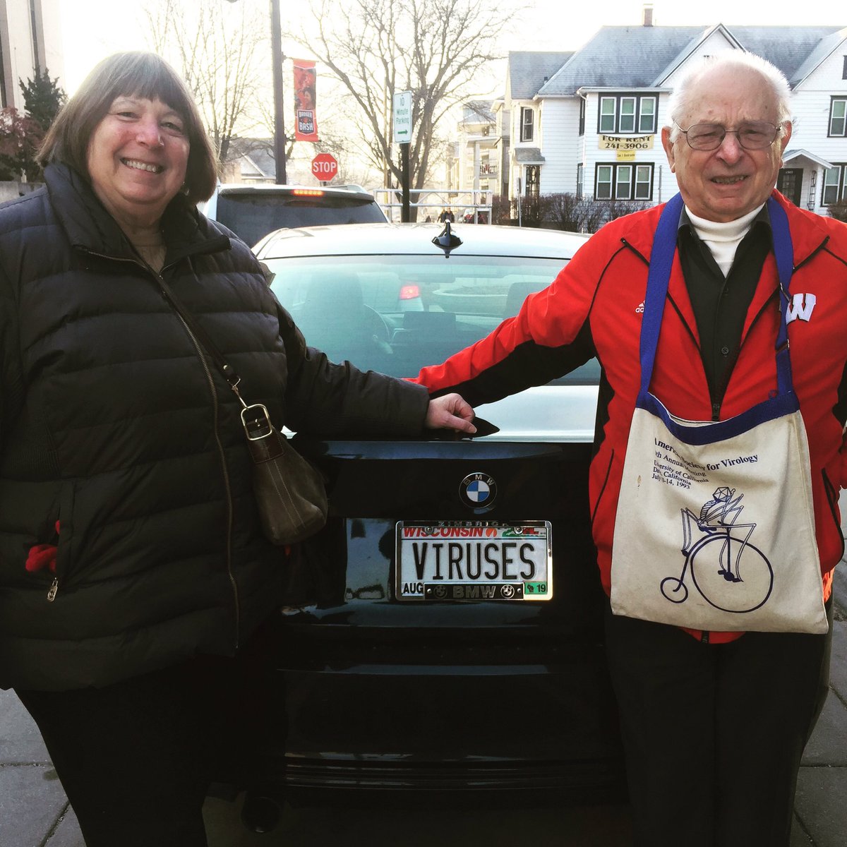 Two awesome virologists in @UWMadison Ann Palmenberg and Roland Rueckert (also known as R cubed). I got the idea for my #viruses license plate from Ann #TWIVpic.twitter.com/UlugvzvvQT