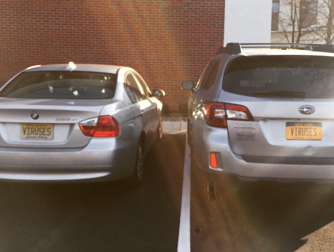 Cara Pager @pagerlab at @ualbany has VIRUSES plate in NY! We could not resist photographing our cars together. Now I know four VIRUSES plates - with Ann Palmenberg in WI and Jessica in CA. Who else has a viruses plate?pic.twitter.com/Ch4kyoig0p