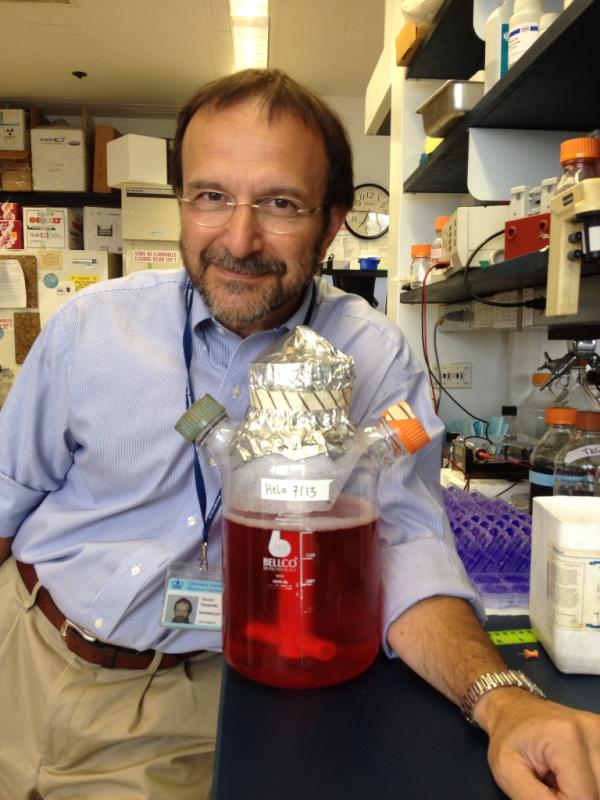 A man and his #HeLa cells. We are up to a 3000 mL spinner, three times a week.pic.twitter.com/39CIc4lU