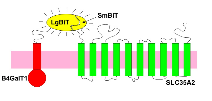 NanoBiT assay: a useful tool to study complexes formed by glycosylation-related enzymes and transporters of the Golgi apparatus. Showed that the sugar transporter SLC35A2 associates with beta-1,4-galactosyltransferase (B4GalT1).