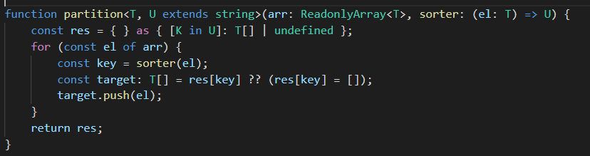 Here's a nice helper function function partition<T, U extends string>(arr: ReadonlyArray<T>, sorter: (el: T) => U): { [K in U]: T[] | undefined } { The callback returns a property key; the resulting object has each element in the corresponding property arraypic.twitter.com/26JJa2KaZk