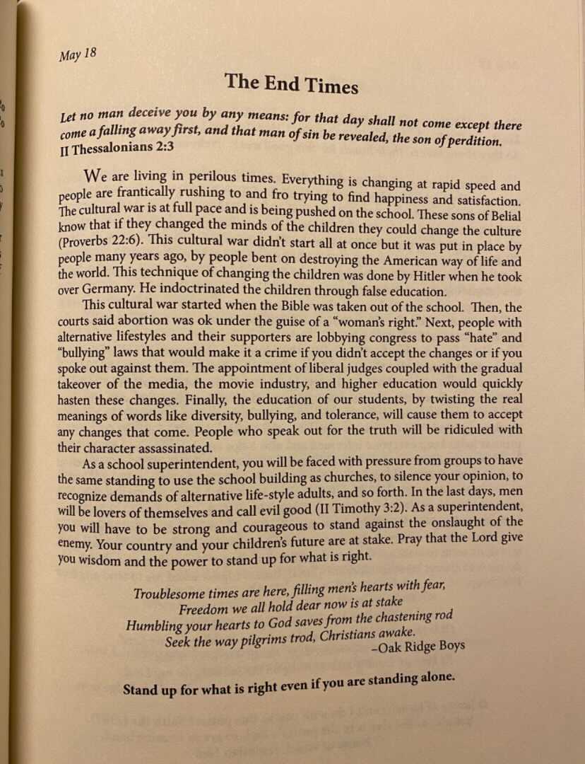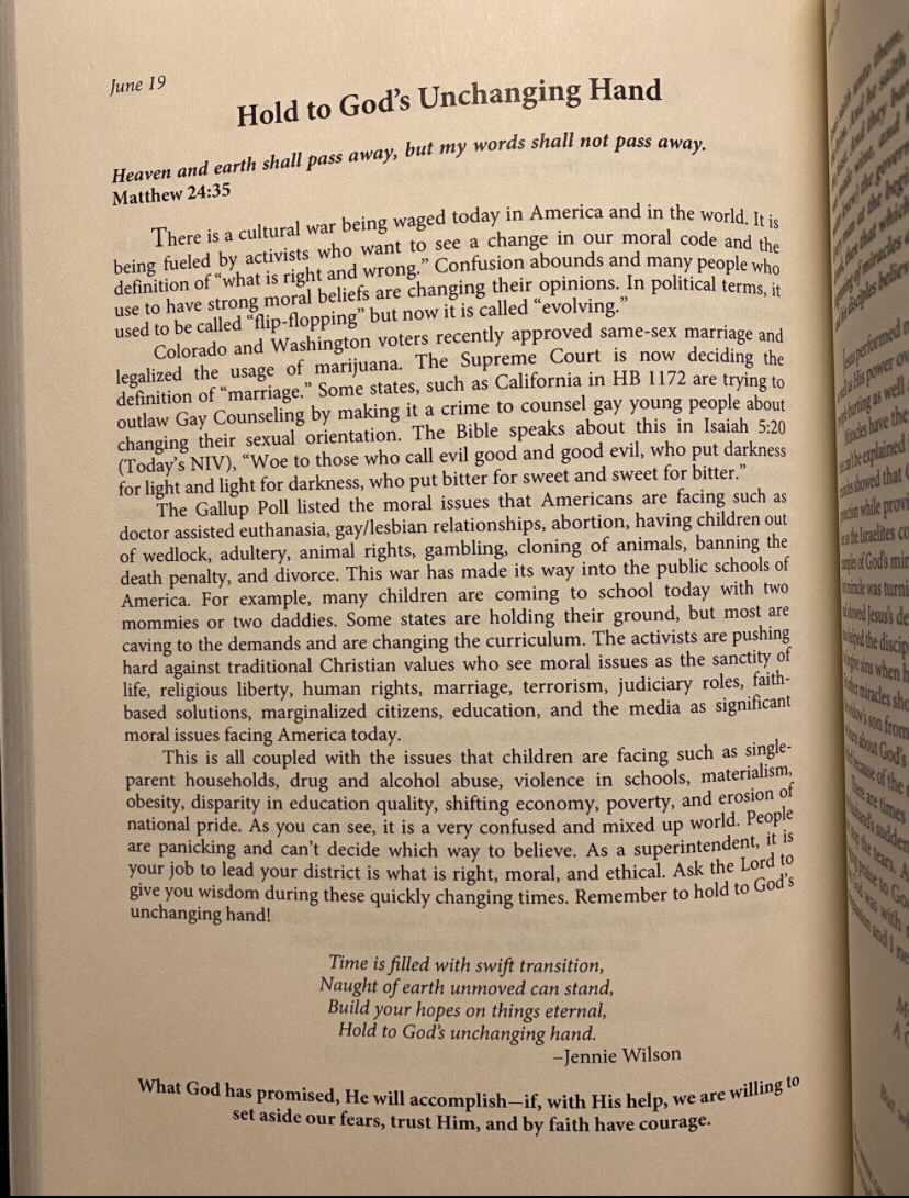 This same superintendent co-authored a book in 2014 warning that those pushing for acceptance of “alternative lifestyles" are doing so through the indoctrination of children in schools, as “was done by Hitler when he took over Germany.” Here are a couple passages: 4/pic.twitter.com/NkHm56GT8A