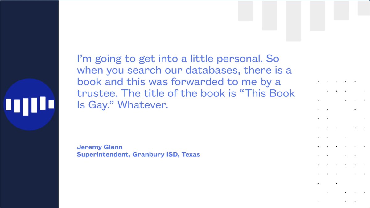 This paragraph — in which a Texas school superintendent, in a leaked recording, talks to a group of librarians he has summoned to a meeting — is just chilling as can be.