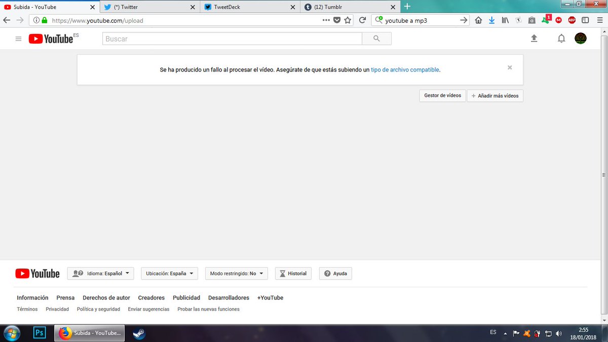 A Youtube le pasa algo, llevo desde ayer intentando subir un vídeo usando diferentes formatos, resoluciones etc., y me dice que na nai, que hubo un error y que posiblemente el vídeo no sea compatible.
