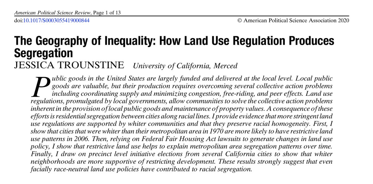 Author: @trounstine Link: https://www.cambridge.org/core/journals/american-political-science-review/article/geography-of-inequality-how-land-use-regulation-produces-segregation/BAB4ABDF014670550615CE670FF66016 …pic.twitter.com/1BxVIXx4Ea