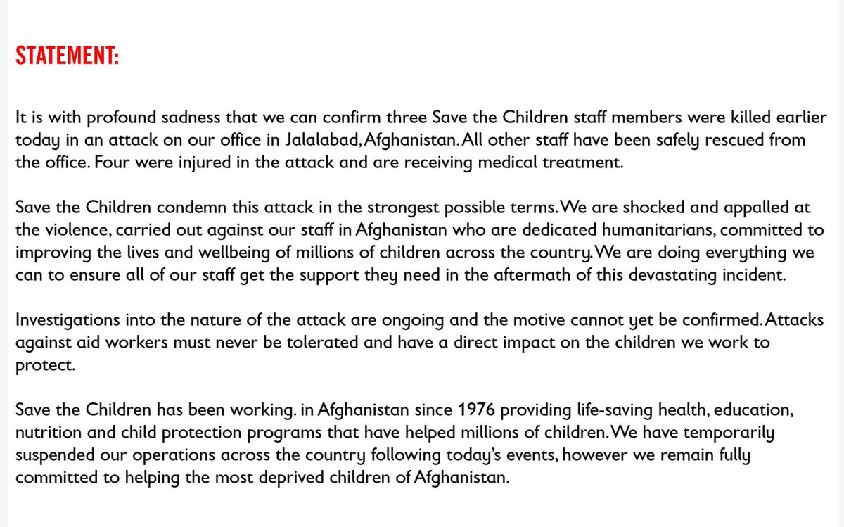 #Jalalabad#Afghanistan We are shocked and appalled at this violence against dedicated humanitarians committed to helping children in need.pic.twitter.com/cl8jlOLg3j