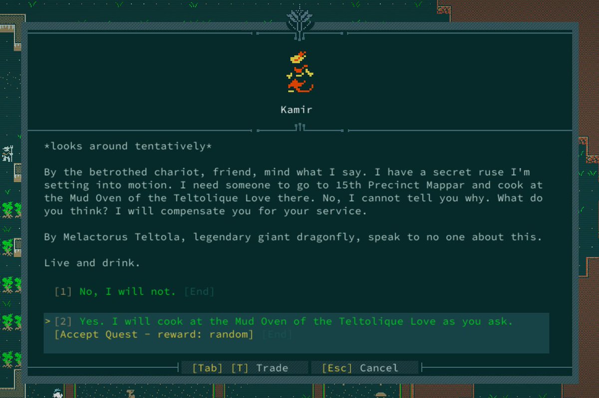 New followers: you may want to check out the weird game we're making, Caves of Qud It's a far-future, sci-fantasy RPG that's heavy on language, simulation, & sentient plants. The tagline is "Chisel through a layer cake of thousand-year-old civilizations." http://www.cavesofqud.com/ pic.twitter.com/ZcLBPwE2IB