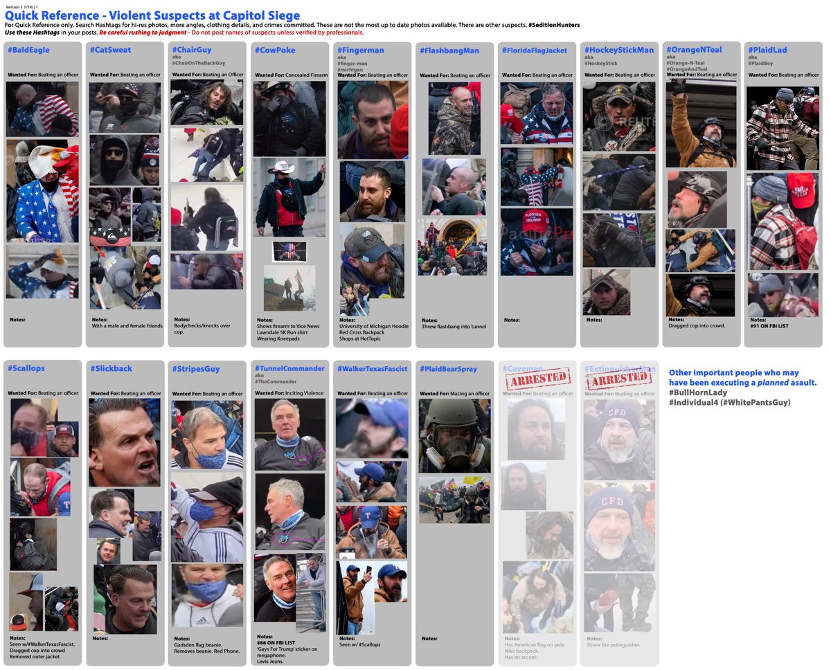 #SeditionHunters#CapitolSiege VIOLENT Suspect Chart (update F) There are other suspects. Do not publicly name suspects before the media. Please join one of the organized efforts.@jsrailton@no_nazis_please Added:#PlaidBearSpray#FlashbangMan#BullHornLady#Individual4pic.twitter.com/Th7uV8Uvgl