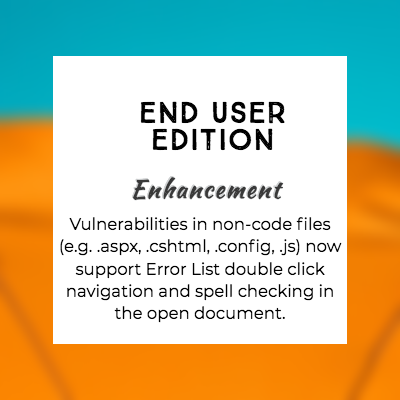 We're excited to share that non-code files (.aspx, .cshtml, .config, .js) support error list double click navigation and spell checking in the open document with the Puma Scan End User Edition. https://pumascan.com/resources/pro-release-0-9-5/ …pic.twitter.com/7nO2ygT39T