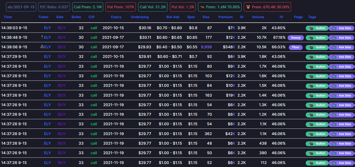 $ELY 30c 9/17, 9956 contracts at .55 (above ask), $548k 33c 11/19 with increasing volume as wellpic.twitter.com/YJKLxD4bIz