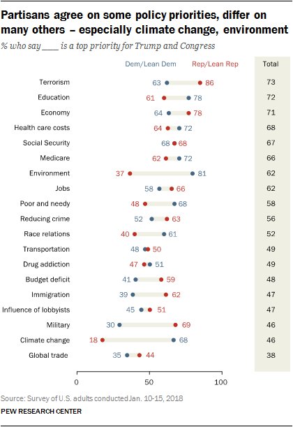 Climate change is low on Americans' list of top policy priorities, but there are wide political divides among those who say so. Nearly 7-in-10 Democrats and just 18% of Republicans say dealing with climate change should be a top policy priority this year https://pewrsr.ch/2G01UKu pic.twitter.com/DwEz9RUZzQ