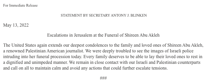 Update: US "again extends our deepest condolences to the family and loved ones of Shireen Abu Akleh, a renowned Palestinian American journalist." -