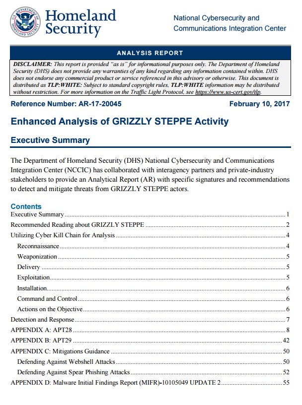DHS today released an "enhanced analysis" of Russian cyber campaign. Threat profile, signatures, mitigation help. https://www.us-cert.gov/sites/default/files/publications/AR-17-20045_Enhanced_Analysis_of_GRIZZLY_STEPPE_Activity.pdf …pic.twitter.com/1wCzmsTuKV