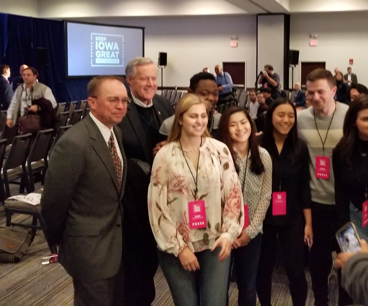 Journalists posing with Mick Mulvaney and U.S. Rep. Mark Meadows of North Carolina before