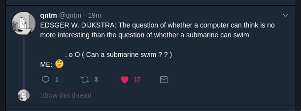 EDSGER W. DIJKSTRA: The question of whether a computer can think is no more interesting than the question of whether a submarine can swim