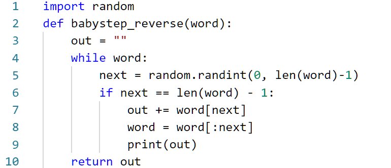 import random def babystep_reverse(word): out = "" while word: next = random.randint(0, len(word)-1) if next == len(word) - 1: out += word[next] word = word[:next] return out
