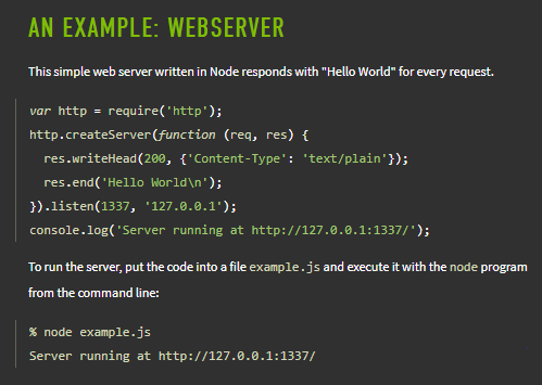I maintain, without any evidence, that one of the main reasons that Node.js became popular is that, for the first six years of the project's existence, the example JavaScript code for creating and starting a webserver was right there on the landing page https://web.archive.org/web/20150831211614/http://nodejs.org/ …pic.twitter.com/w2WVek5B44