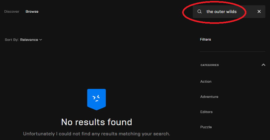 Wow, Epic Games Store is so stupid that if I search for "the outer wilds" (actual full game names: "Outer Wilds" and "The Outer Worlds") it gives me no results AT ALL? Not one single approximate match?pic.twitter.com/X8mKpLEqeT