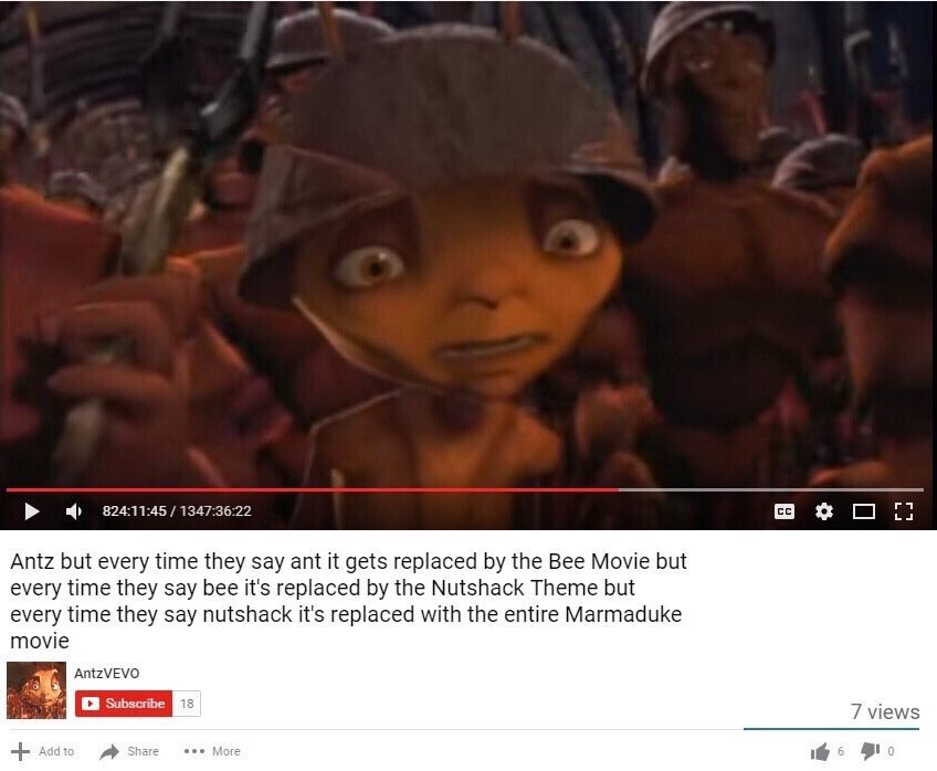 Antz: 1h23, "ant" said 30 times Bee Movie: 1h31, "bee" said 172 times Nutshack theme: 1m06, "nutshack" said 20 times Marmaduke: 1h27