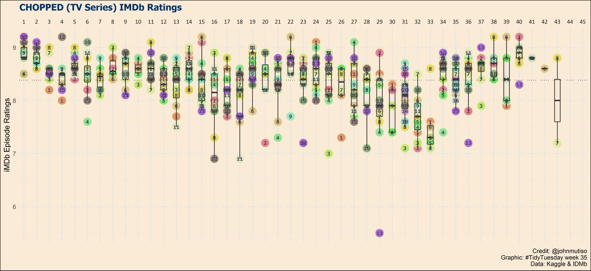 #Chopped was the exploration for#TidyTuesday week 35. Visualized the episodes IMDb ratings for all the Seasons to check ratings overall distributions. code: http://bit.ly/33vxixL#r4ds#rstatspic.twitter.com/kS1Itnb4nz