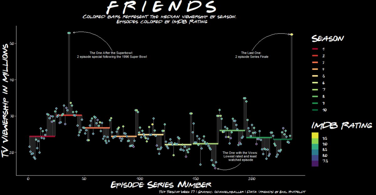 Week 37: Inspired by some great plots for Avatar a couple weeks ago, I decided to look at viewership and IMDB ratings across all episodes of friends for