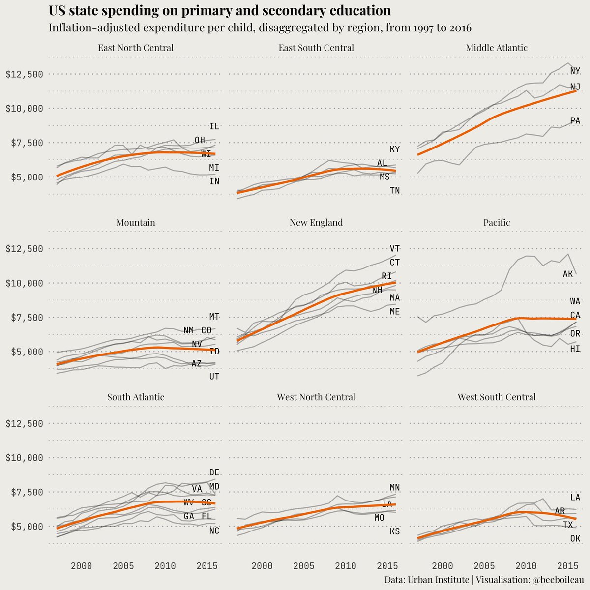 #TidyTuesday / US Spending on Kids - Weed 38 This graphic shows the "Public spending on elementary and secondary education from 1997 to 2016 by US states"#tidyverse#dataviz#RStatspic.twitter.com/N3yLMZACSf