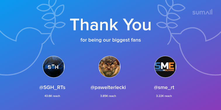 Our biggest fans this week: SGH_RTs, pawelterlecki, sme_rt. Thank you! via https://sumall.com/thankyou?utm_source=twitter&utm_medium=publishing&utm_campaign=thank_you_tweet&utm_content=text_and_media&utm_term=66e8d8a84ed90c82314f165b …pic.twitter.com/qcKpofo29r