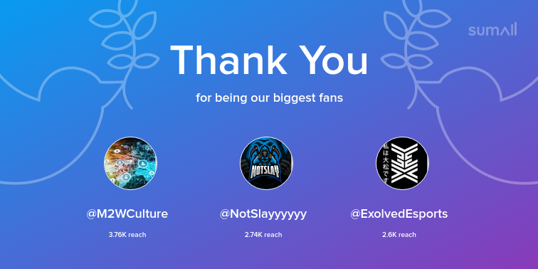 Our biggest fans this week: M2WCulture, NotSlayyyyyy, ExolvedEsports. Thank you! via https://sumall.com/thankyou?utm_source=twitter&utm_medium=publishing&utm_campaign=thank_you_tweet&utm_content=text_and_media&utm_term=66e8d8a84ed90c82314f165b …pic.twitter.com/RckOodEuMK