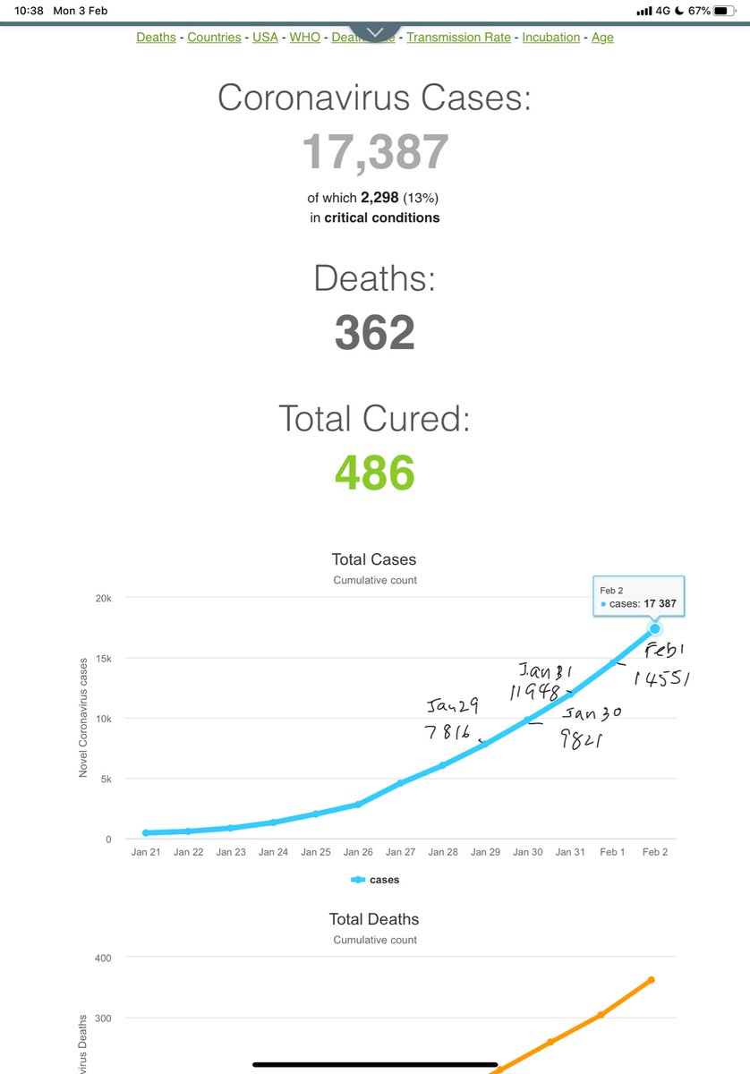 จำนวนผู้ติดเชื้อไวรัสโคโรน่าตามรายงานล่าสุดถึงวันที่ 2 กุมภาพันธ์อยู่ที่ 17387 คน หากดูสถิติจะพบว่าใน 5 วันที่ผ่านมา แต่ละวันจะมีเคสเพิ่ม 25.68%,21.6%,21.78%และ19.4% ตามลำดับ ด้วยอัตราการเพิ่มนี้ จำนวนเคสได้เพิ่มขึ้นเป็นสองเท่าภายใน 3-4 วันเท่านั้น อีก 4 วันจะเป็นอย่างไรpic.twitter.com/uSdRKNckU6