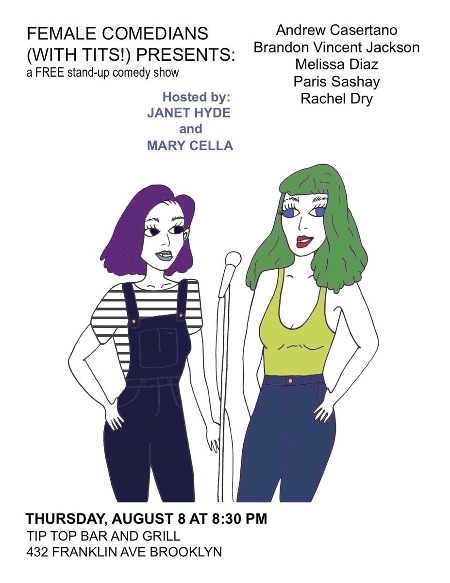 TONIGHT AT 8:30 IN BED-STUY, @janet_hyde1 and I host a FREE comedy show featuring: @rachel_dry! @ParisSashay! @meldiazcomedy! @BJaxComedy! @andrewcasertano! pic.twitter.com/OKjdnuBv0A