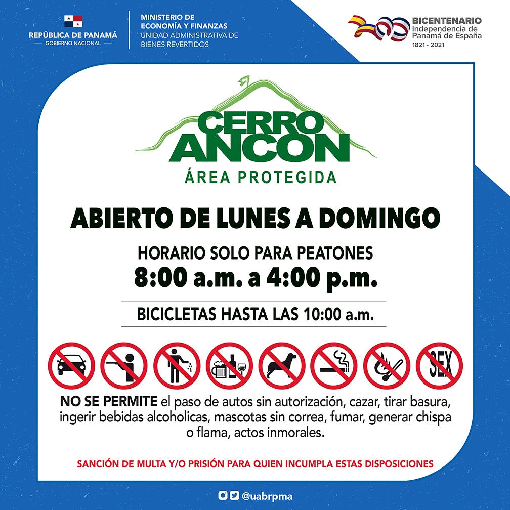 Le invitamos a visitar el Cerro Ancón, respetando el horario y las disposiciones señaladas para conservar la fauna y la flora del área, y mantener limpia esta reserva natural. No olvide llevar agua, ropa cómoda y cumplir con las normas de bioseguridad.